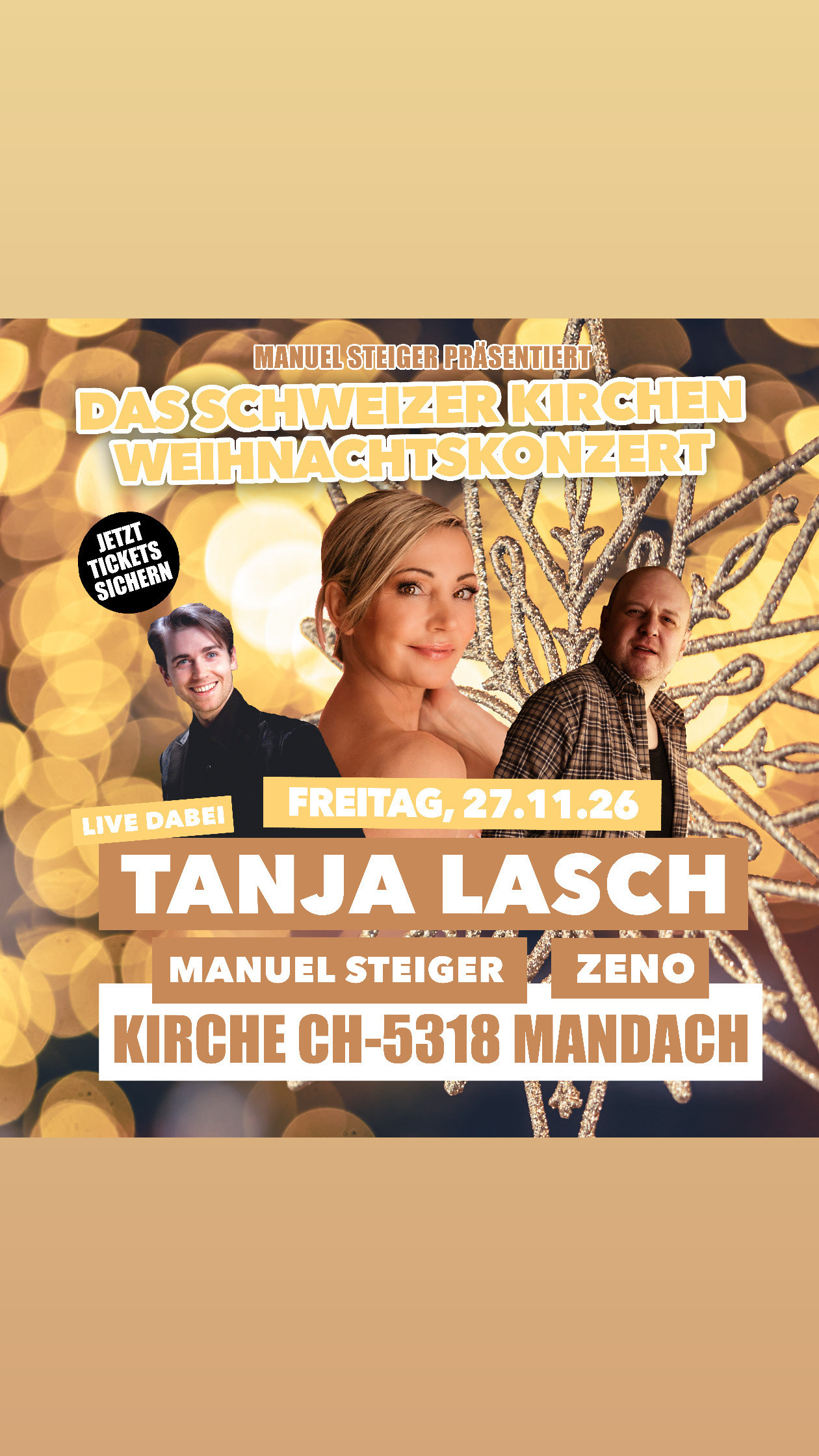 Erleben Sie ein stimmungsvolles Schweizer Schlager Weihnachtskonzert in der Kirche mit den beliebten Künstlern Tanja Lasch, Manuel Steiger und Zeno. Freuen Sie sich auf festliche Melodien und herzliche Stimmung, die Sie perfekt auf die Weihnachtszeit einstimmen.