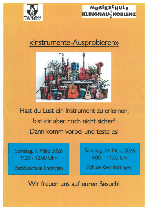 Wer noch eine Entscheidungshilfe benötigt, ist am „Instrumente-Ausprobieren“ vom 7. März 2026, 9.00-12.00 Uhr in der Bezirksschule Endingen oder am 14. März 2026 9.00-11.00 Uhr in der Schule Kleindöttingen herzlich willkommen, die verschiedensten Angebote auszuprobieren und sich bei den Lehrpersonen zu informieren.